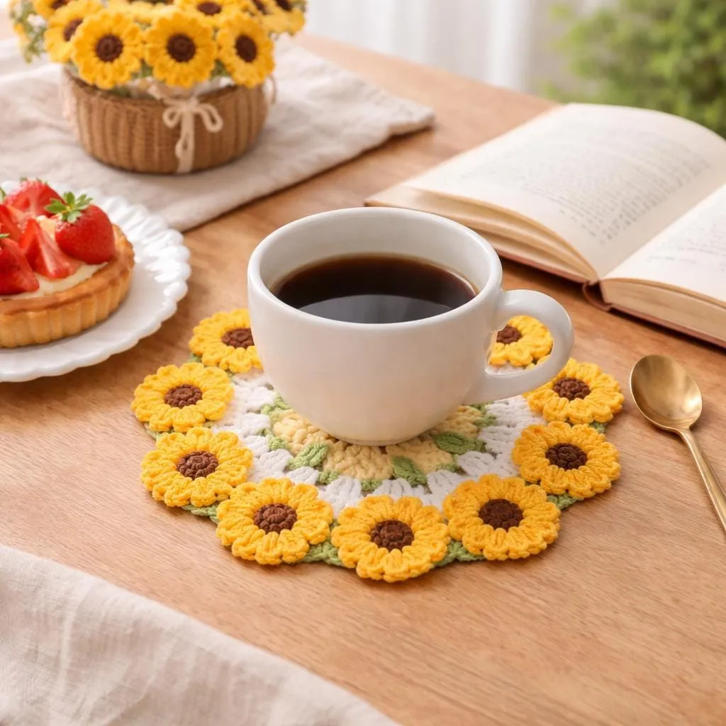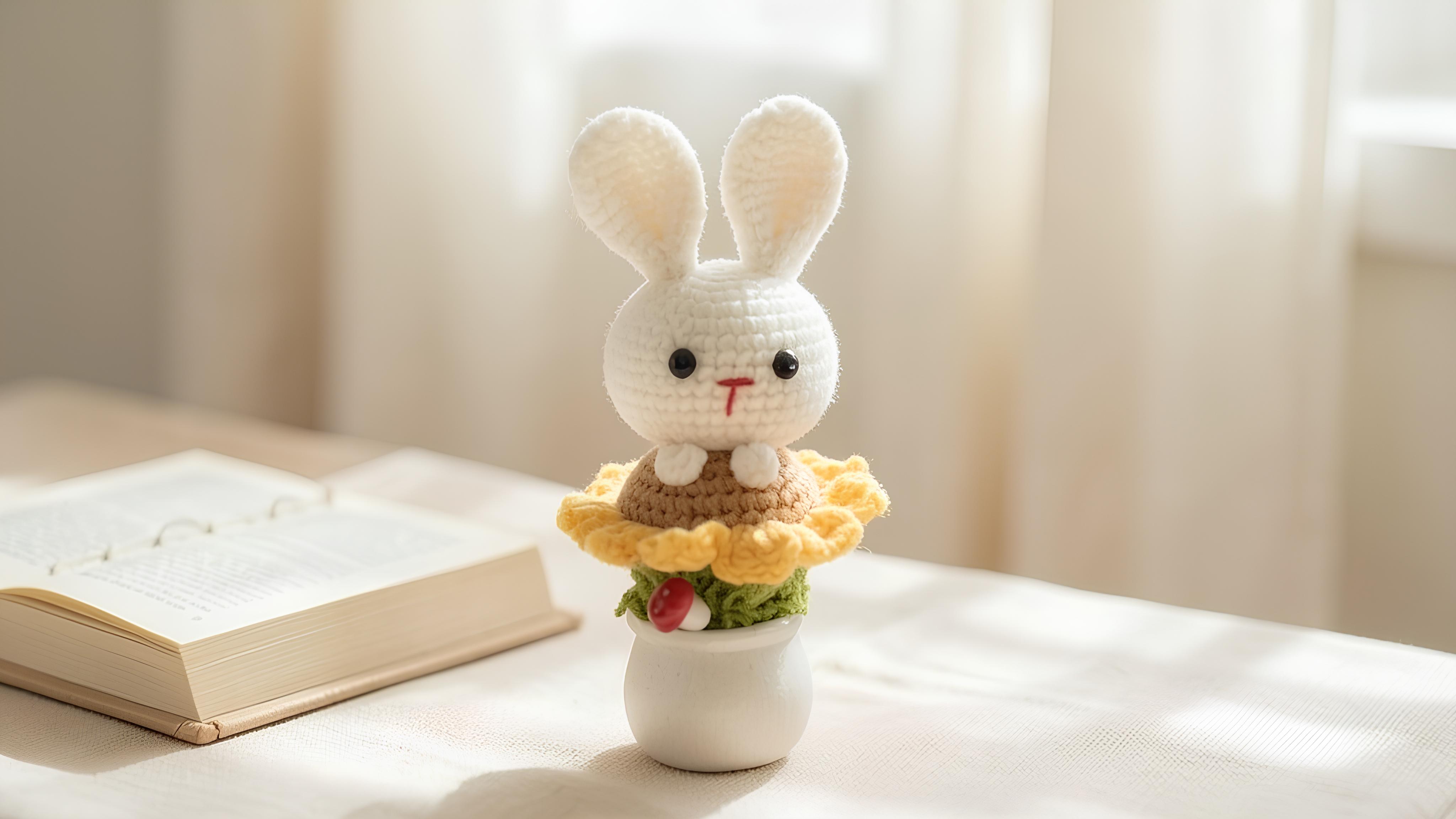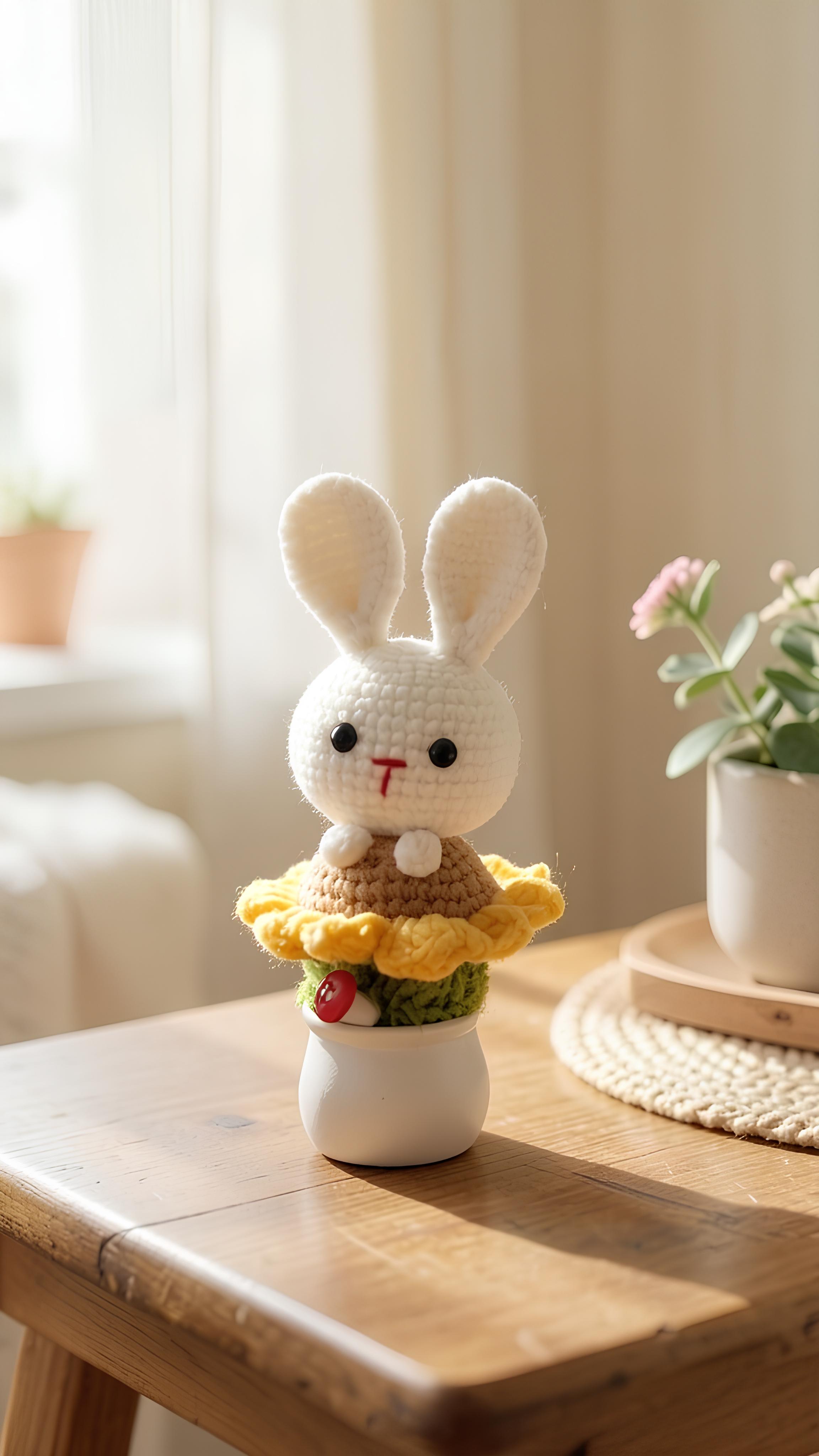 This crocheted sunflower bunny features adorable rabbit ears and sunflower petals. The carefully selected yarn offers a soft touch, and every stitch is sewn by hand. It is perfectly suited for indoor settings, evoking a sense of warmth and delight.